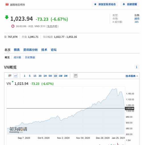 1月19日才上演过史诗级崩盘的越南基准股指胡志明指数(VN INDEX)跌幅扩大至6.67%。1月19日该股指闪崩震惊市场,当天该股指盘中跌超6%,将近抹去年内全部涨幅,近四分之一越南股票齐齐跌停,卖出指令飙升导致交易所崩溃近半小时。