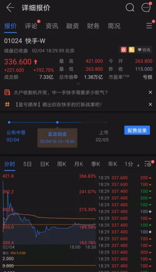 2月4日下午4点多,快手进行暗盘交易,富途证券信息显示,快手开盘大涨报263.8港元/股,最高涨至421港元/股,较发行价115港元/股的涨幅超266%。随后快手股价震荡走低,波动较为剧烈,截至6点半收盘,快手报336.6港元/股,涨幅收于192.70%,总市值达1.38万亿港元,成交额为7.33亿港元。据了解,快手已经超过农夫山泉、蓝月亮、泡泡玛特成为富途暗盘成交额排行榜第一名。