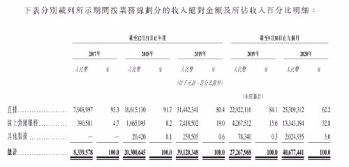 从快手的业务来看,直播收入保持增长,线上营销服务等其他业务的收入增长迅速。招股书显示,2017年、2018年及2019年,快手直播赚取的收入分别为79亿元、186亿元、314亿元,分别占总收入的95.3%、91.7%、80.4%。2020年前9个月,其直播收入为253亿元,占总收入的62.2%%,可见虽然现在直播仍然是快手收入的大头,但是比例在逐步降低。