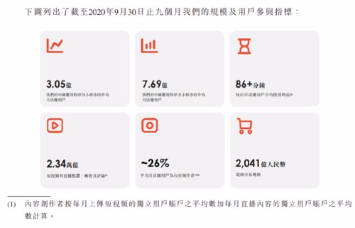 根据艾瑞咨询,快手的内容社区活跃度在中国头部的基于视频的社交平台中排名第一,截至2020年9月30日止九个月的内容创作者占平均月活跃用户在快手应用上的比例约26%;快手应用上每月平均短视频上传量约超过11亿条。