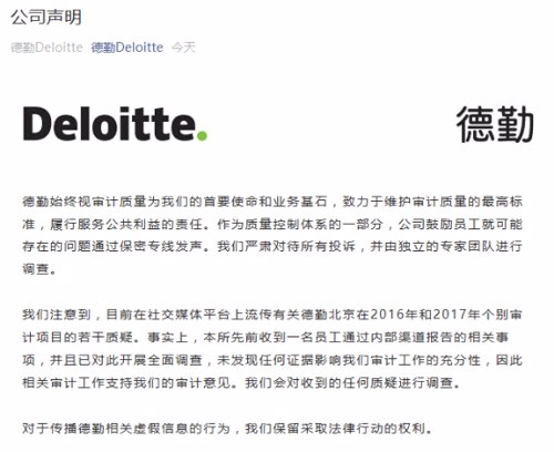 对于上述的举报,德勤5日下午在其官微发布一则公司声明。声明指出: