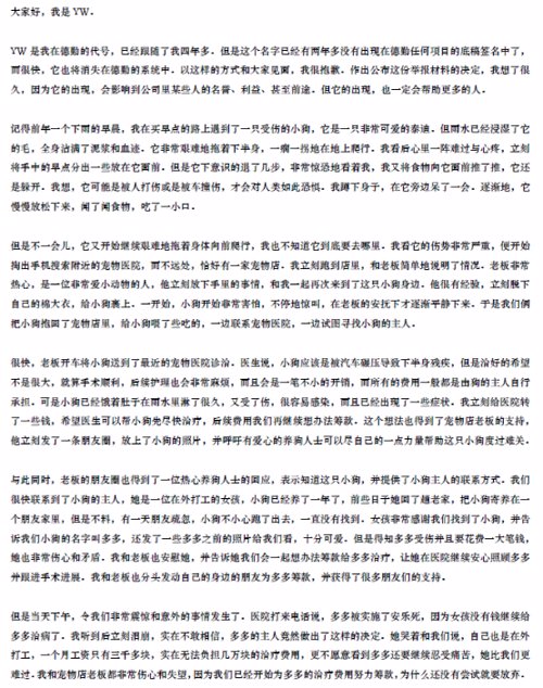 很快,老板开车将小狗送到了最近的宠物医院诊治。医生说,小狗应该是被汽车碾压导致下半身残疾,但是治好的希望不是很大,就算手术顺利,后续护理也会非常麻烦,而且会是一笔不小的开销,而所有的费用一般都是由狗的主人自行承担。可是小狗已经饿着肚子在雨水里淋了很久,又受了伤,很容易感染,而且已经出现了一些症状。我立刻给医院转了一些钱,希望医生可以帮小狗先尽快治疗,后续费用我们再继续想办法筹款。这个想法也得到了宠物店老板的支持,他立刻发了一条朋友圈,放上了小狗的照片,并呼吁有爱心的养狗人士可以尽自己的一点力量帮助这只小狗度过难关。