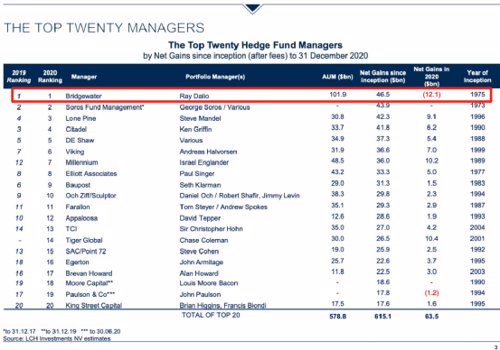 2020年桥水基金的表现并不好,根据LCH,2020年对冲基金平均回报率为11.6%。桥水基金收益却是亏损;桥水在2020年令投资者损失了121亿美元。