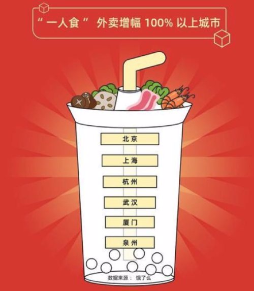 2月12日,饿了么和大润发联合发布了《2021春节就地消费报告》,报告显示,农历廿八至除夕,年夜饭半成品外卖同比增长4倍,年夜饭礼盒外卖同比增长2倍;年夜饭半成品和礼盒外卖增幅最大的几个城市是宁波、哈尔滨、重庆、无锡等,同比增长都在3倍以上。值得注意的是,“一人食”外卖增幅100%以上的城市包括北京、上海、杭州、武汉等,反映了在大城市很多人选择就地过年的情况。