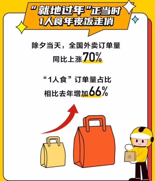 美团外卖数据也显示,除夕当天外卖订单量同比增长70%;“1人食”订单量占比相比去年增长了66%,很多人没法回家的打工人,选择除夕同家人“云吃饭”。