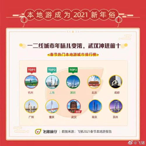 飞猪昨天发布了2021年春节本地游报告,其数据显示,春节期间低风险地区的本地游需求较为旺盛,预订量同比涨超660%,玩酒店、逛景区和“云旅游”成为春节热选。