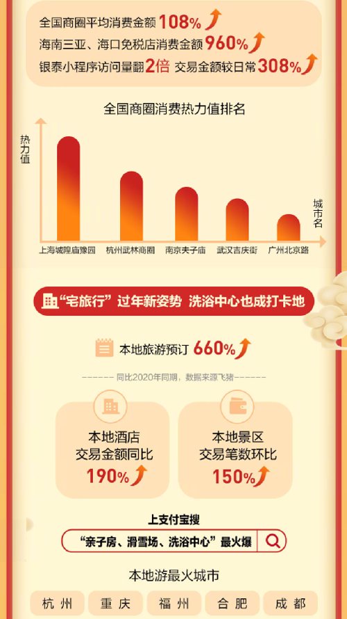 支付宝发布的数据显示,今年春节假期,全国商圈在支付宝平台平均消费金额增长108%。本地酒店交易金额同比增长190%,本地景区交易笔数环比增长150%。上支付宝搜索亲子房、滑雪场、洗浴中心最火爆,成为支付宝上“就地旅游”热搜前三。