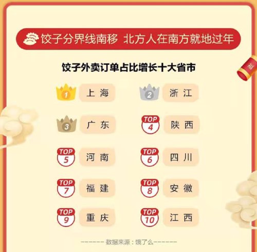 就地过年还反映在传统北方过年必吃的一种食物“饺子”上,支付宝发布的数据显示,今年饺子外卖订单占比增长最厉害的是上海、浙江、广东等几个南方城市,反映北方人在南方就地过年,喜欢点饺子外卖寄托思乡之情,使得饺子的分界线向南移动。