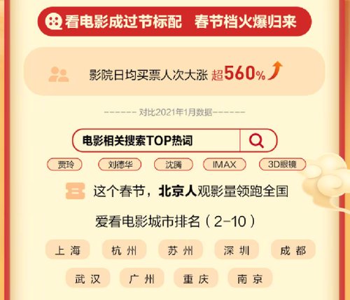 支付宝2月17日发布的数字生活新春报告显示,对比2021年1月数据,2月影院日均买票人次大涨超560%。这个春节,北京人观影量领跑全国,还有上海、杭州、苏州等城市的小伙伴也很爱看电影。