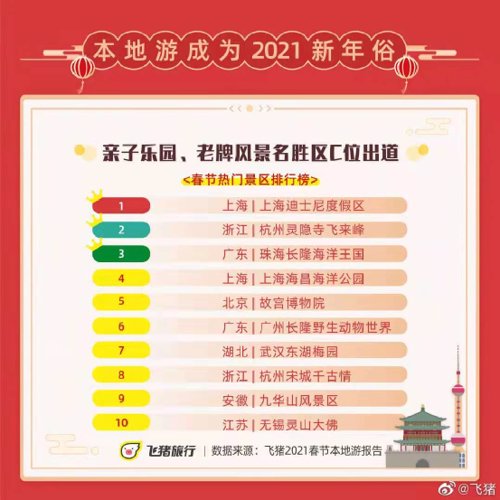 其中,春节热门本地游城市排行榜,第一是杭州,第二是上海,第三是深圳,还有北京、成都、广州、重庆、武汉等地。热门景点包括上海迪士尼度假区、杭州灵隐寺飞来峰、珠海长隆海洋王国、上海海昌海洋公园、北京故宫博物院等。