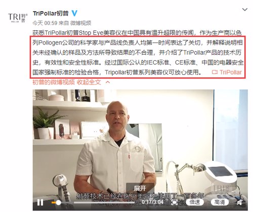 接着,在今天下午1点左右,TriPollar初普官方微博再次表示,一次约4分钟的使用,前后对照发现,皮肤表面最后的温度为38.9°C。Stop Eye美容仪的温度是有效且安全的。