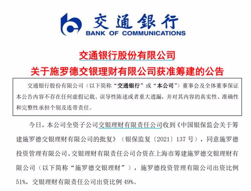 这是第三家获批筹建的合资理财公司,也是自2005年施罗德投资集团和交通银行共同发起交银施罗德基金管理有限公司以来,两家集团在资管领域的再度携手。