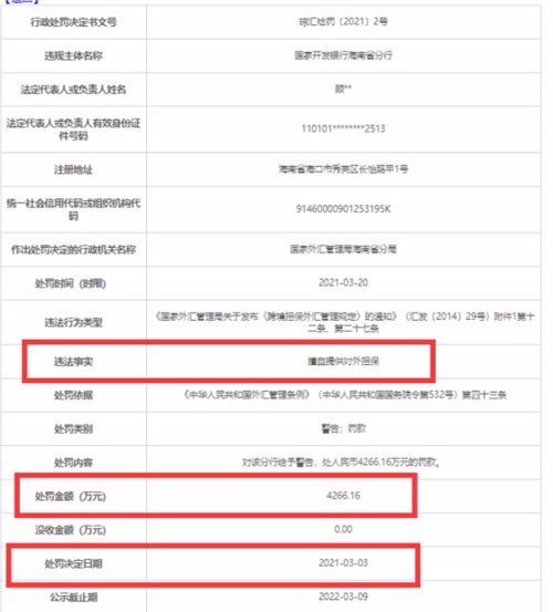 国家外汇管理局海南省分局近日公布的行政处罚决定书显示,国家开发银行海南省分行存在擅自提供对外担保的违法事实。
