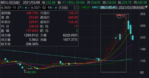 2020年11月27日至2021年2月19日的三个多月时间,百度股价大涨150%至339美元,市值一度突破1000亿美元。今年2月22日更是达到盘中最高价每股354.82美元。
