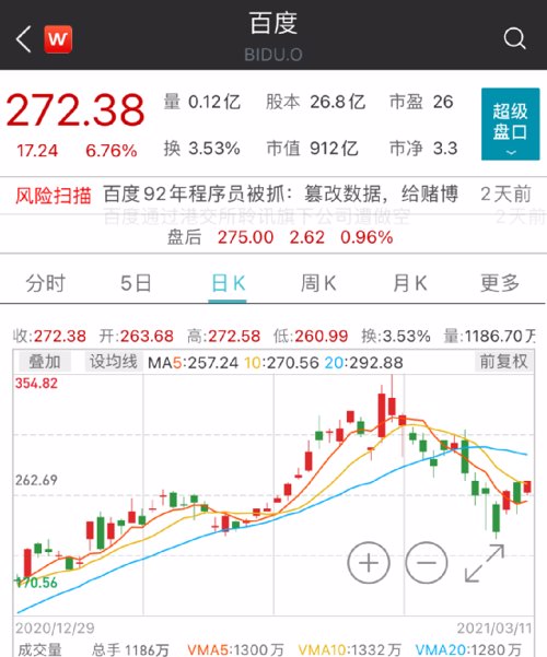 隔夜,百度美股大涨6.76%,报272.38美元/股。
