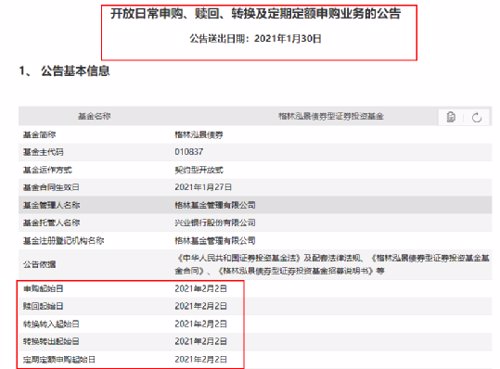值得一提的是,就在1月30日,该基金刚发布将于2月2日开放日常申购、赎回、转换及定期定额申购业务的公告。