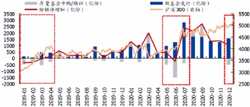 据国盛证券统计,从历史偏股基金赎回的情况来看,短期赎回规模有限,不必过于担忧。从偏股基金份额的角度考虑,国盛证券用基金协会公布的股票型+混合型基金存量份额的变化来近似估计每月基金份额的净增加(该数据当前暂停更新,截至2020年12月),基金份额净增加与新发行偏股基金份额的差值来估算存量基金的申购赎回。