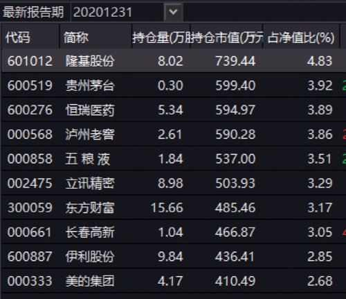 基金四季报显示,截至去年底,南华丰淳股票持仓比例为93.79%。隆基股份、贵州茅台、恒瑞医药、泸州老窖、五粮液、立讯精密、东方财富、长春高新、伊利股份、美的集团等现身该基金前十大重仓股。