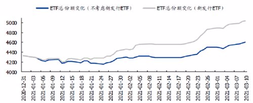 考虑到当前偏股基金赎回数据的不可得,国盛证券用股票型ETF基金的高频数据来进行间接的验证。“截至到2021年3月10日,股票ETF基金的总份额持续增加,即使将2021年以来新发行的ETF基金剔除后,存量ETF基金也是净申购,这与我们对偏股基金的判断一致。”