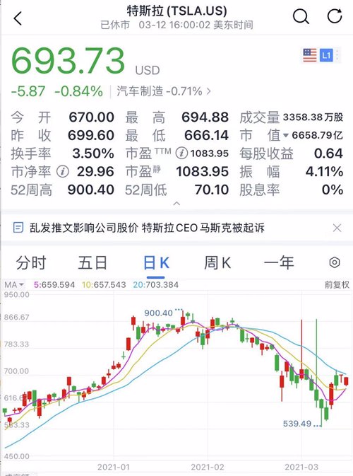 此后两日,特斯拉股价表现依旧强势,截至美东时间3月12日,特斯拉股价报693.73美元/股,市值达到6658.79亿美元。