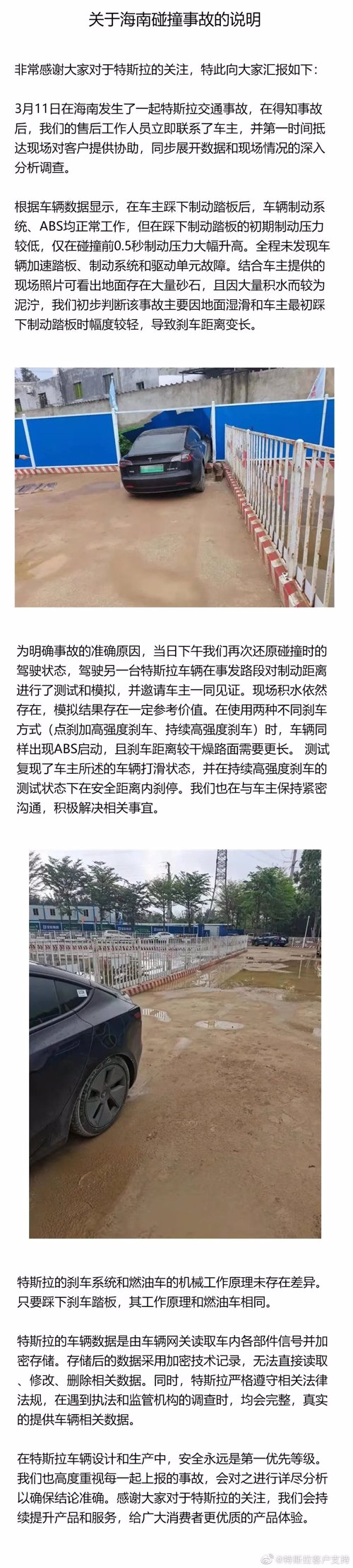 特斯拉指出,为明确事故的准确原因,当日下午其再次还原碰撞时的驾驶状态,驾驶另一台特斯拉车辆在事发路段对制动距离进行了测试和模拟,并邀请车主一同见证。
