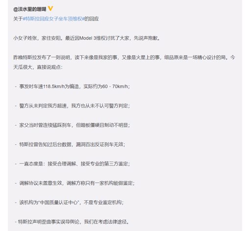 不过,就在大家以为舆论开始往特斯拉有利的一面发展时,当事维权女车主,也在微博现身发声,同时罗列该事件的起始经过,并且用数据说话,证明特斯拉公关设了一个大局,将舆论导向有利于自己的一面,而且特斯拉的回应也是漏洞百出。