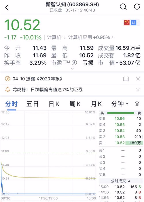 3月17日上午,A股开盘6分钟,一只叫新智认知的股票就无端端闪崩跌停,期间曾短暂撬板,但最后还是封死跌停板,截至收盘,新智认知报10.52元/股,跌幅10.01%,封单1.89万手,市值超53亿。