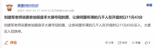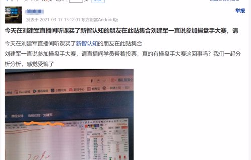 有投资者发帖称,一个叫刘建军的人,说要参加操盘手大赛夺冠的票,让房间里听课的几千人在开盘时以11元43分买入,大家买入后跌停。