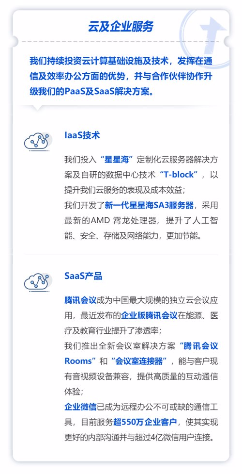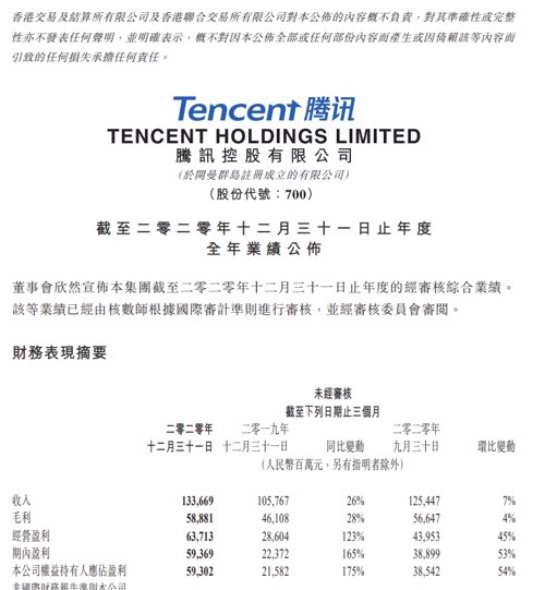 马化腾表示:“尽管二零二零年充满史无前例的挑战,我们各项业务取得稳健的业绩,印证了我们对用户价值、科技创新及业务可持续性的专注。在消费互联网,我们通过丰富产品内容及一系列的创新,进一步延伸领先地位,以游戏为起始点的国际业务也有长足进展。在产业互联网,我们凭借旗舰SaaS产品及升级的云基础设施,进一步渗透到各行各业。我们将一如既往地践行‘科技向善’,与行业合作伙伴携手,为用户、企业乃至整体社会带来不断价值提升的产品及服务。”