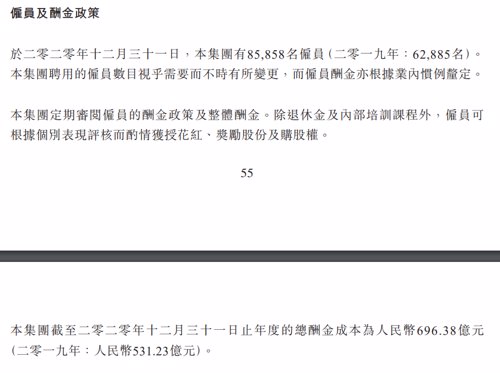 再次回到拉仇恨的时间。财报显示,腾讯2020年有85858名员工,其中总酬金成本为人民币696.38亿。