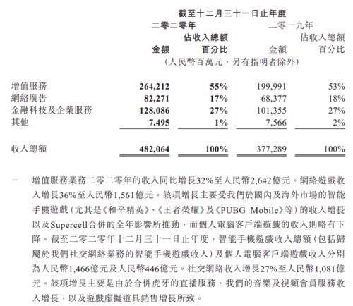 截至二零二零年十二月三十一日止年度,智能手机游戏收入总额(包括归属于社交网络业务的智能手机游戏收入)及个人电脑客户端游戏收入分别为1466亿元及446亿元。社交网络收入增长27%至人民币1081亿元。该项增长主要是由于合并虎牙的直播服务、音乐及视频会员服务收入增长,以及游戏虚拟道具销售增长所致。