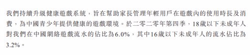财报中首次披露外界关切的未成年游戏消费数据,去年第四季度,腾讯国内游戏流水中16岁以下未成年人占比为3.2%,并表示公司将持续升级健康系统,为青少年提供健康的游戏环境。近一个月数据显示,每天有1784万未成年帐号因登录时长超标被系统强制“踢”下线。