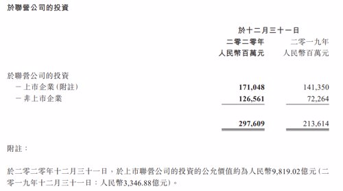 整个2020年,公司投资联营公司公允价值从去年底的3347亿增加到9819亿元,公允价值净增6472亿,相当于第四季度再度增加2400亿。