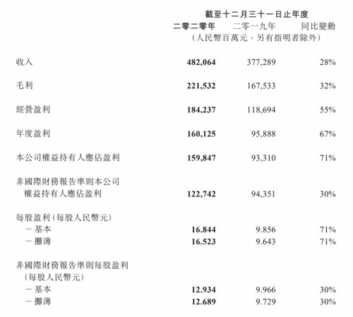 -年度盈利为人民币1,601.25亿元(245.41亿美元),增长67%;净利润率由去年的25%上升至33%。