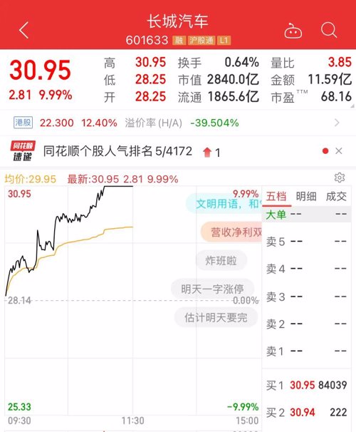 受消息影响,上午收盘,长城汽车股价拉升涨停,总市值超2400亿元;H股盘中也涨超12%。