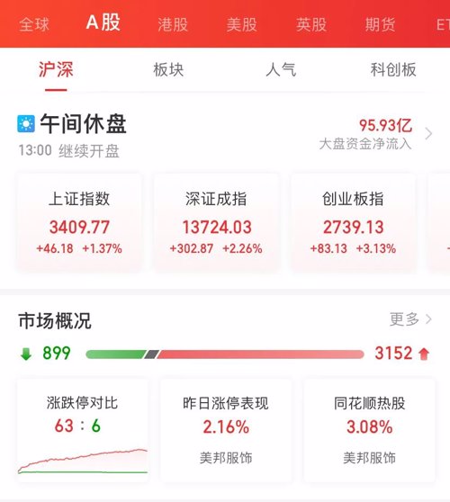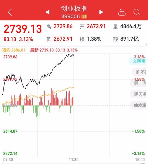 上午收盘,上证指数大涨1.37%,站上3400点,深证成指涨2.26%,创业板指数更是大涨3.13%,上午两市成交额4441亿元,个股普涨。