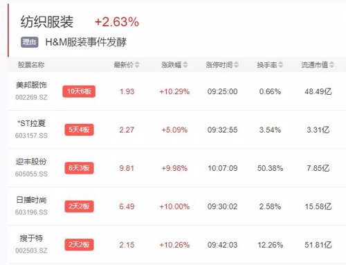 A股的纺织服装股也表现强劲,美邦服饰、搜于特等涨停。