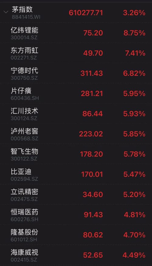 电池茅、中药茅、疫苗茅等各类茅台涨势凶猛,茅指数暴涨3.26%,亿纬锂能、东方雨虹、宁德时代、片仔癀、汇川技术、智飞生物、恒瑞医药等茅族股暴涨。