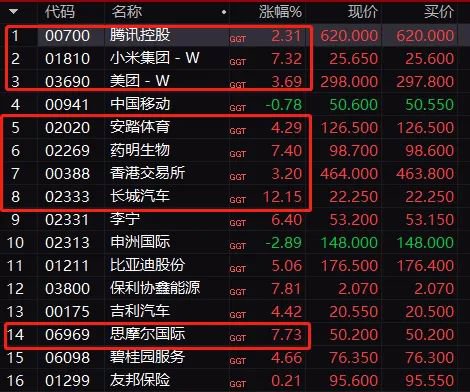 上午,港股也大涨,恒生指数涨逾1%,恒生科技指数大涨逾2%。港股核心资产腾讯涨超2%,美团、港交所涨超3%。