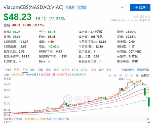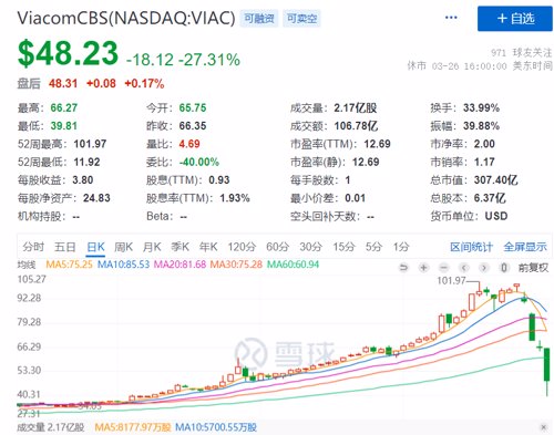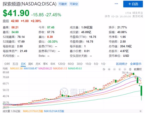 更加吊诡的是,跟爱奇艺、腾讯音乐同步暴跌走势的,不止是中概股,还有两家公司,一个是Viacom,另一个是探索频道。