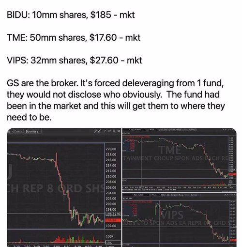 Viacom开了第一枪,由于一路杠杆加仓,好巧不巧,重仓的中概股又有不少利空消息,手里持仓的百度、腾讯音乐、爱奇艺、唯品会纷纷开始下跌,结果爆仓了,就把带血的筹码交出来。于是就出现了周五晚上美股中这些中概股的第二轮暴跌。小小“蝴蝶效应”就导致“瀑布式下跌”。
