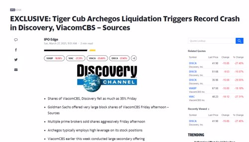 经过周末外媒的报道,矛头指向了结果指向韩国人对冲基金经理Bill Hwang,其运作的家族投资基金Archegos Capital惯于使用高杠杆,据说加了三到四倍的杠杆。其重仓了Viacom、Discovery、百度、腾讯音乐等相关股票。