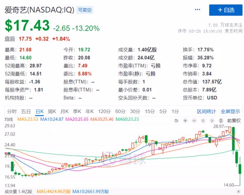爱奇艺,前几天股价最高29,一度跌至14.6,三天时间就跌没一半