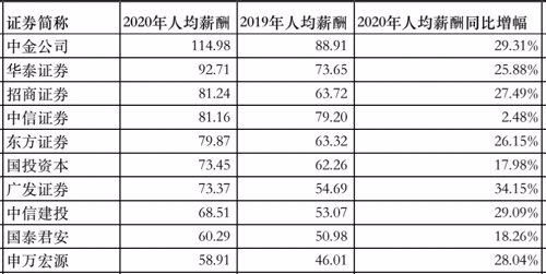 有数据可查的券商中,2020年人均薪酬排名前十的券商去年总体呈现“涨薪”状态。
