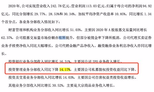 值得注意的是,在资管业务营收排名前十的券商中,招商证券是唯一一个资管业务营收及净利润双降的公司。招商证券在财报中表示,投资管理业务分部收入同比下降14.17%,主要因公司私募股权投资收益同比下降。