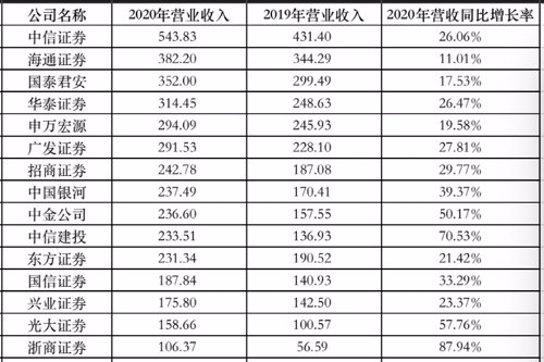 在已披露年报的券商中,共有15家券商2020年营业收入破百亿。