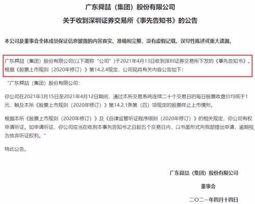 4月13日晚间,*ST舜喆B公告称,公司收到深交所下发的《事先告知书》:公司在3月15日至4月12日期间,连续20个交易日的每日股票收盘价均低于1元,触及股票终止上市情形。深交所表示,公司有权申请听证。