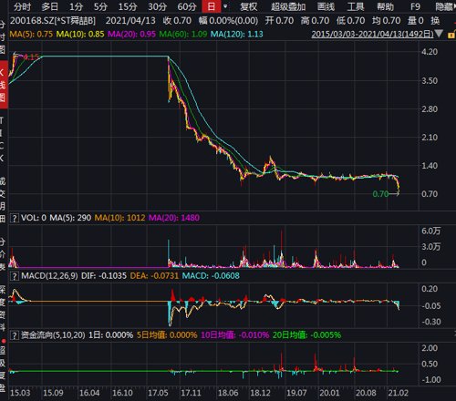 盘面显示,2017年8月,*ST舜喆B股价一度超过4港元,但随后持续下跌,最新(4月12日)收盘价只有0.7港元,三年多累计跌幅达到83%。
