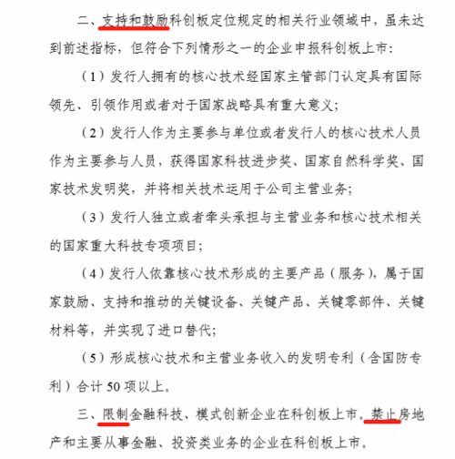 “限制金融科技、模式创新企业在科创板上市;禁止房地产和主要从事金融、投资类业务的企业在科创板上市。”