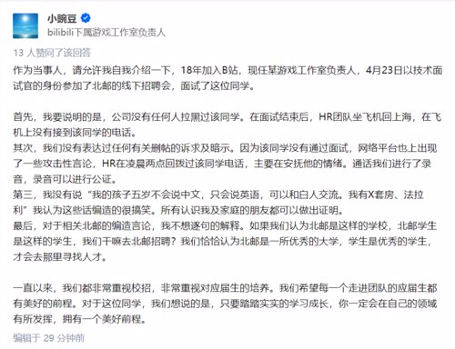 4月25日,B站在知乎平台做出回应。B站表示,经调查,面试员存在说教与争论等不职业行为,但不存在攻击北邮等言论。
